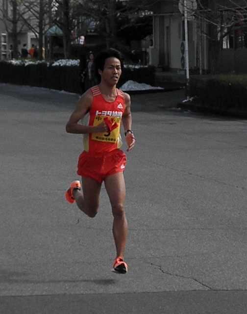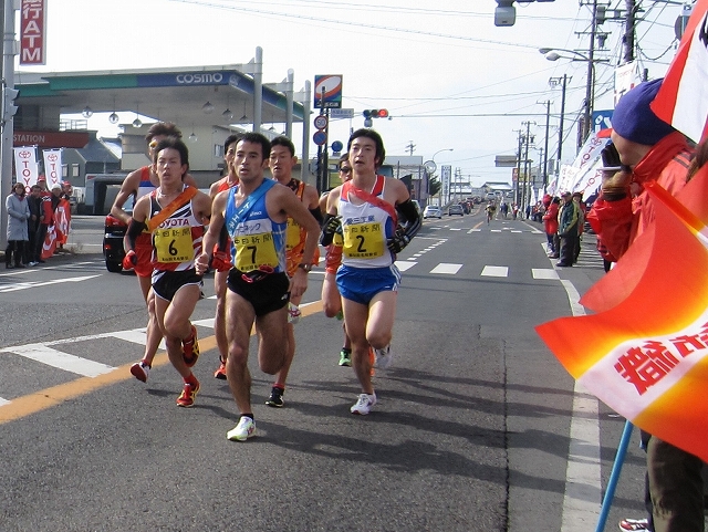 最終6区はニューイヤー駅伝のエース区間4区を走った椎谷選手。ニューイヤー駅伝では消極的な走りで順位を落としてしまいましたが、今回は序盤から前を追う攻めの走りをみせます。中間地点で2位のスズキ浜松ACを捕らえると、勢いそのままに先頭トヨタ自動車を追います。