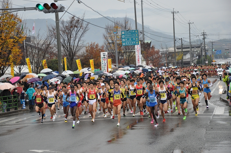 大勢の実業団選手が一斉に甲佐町役場前をスタート
