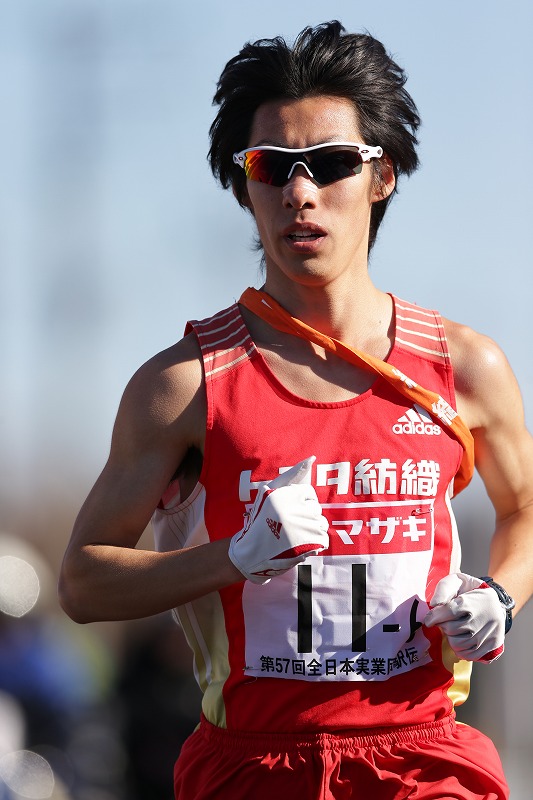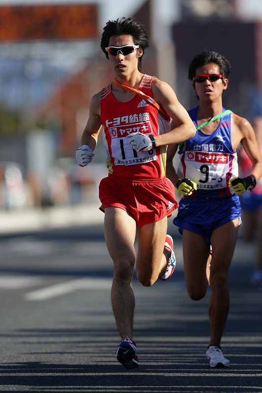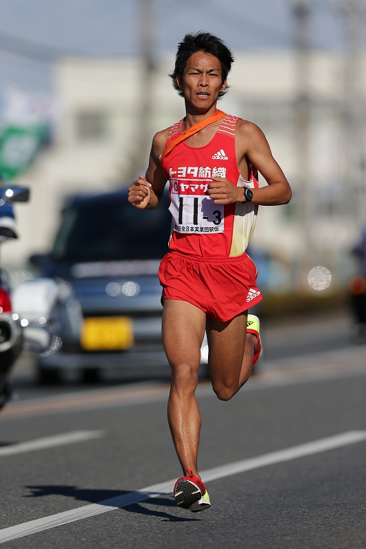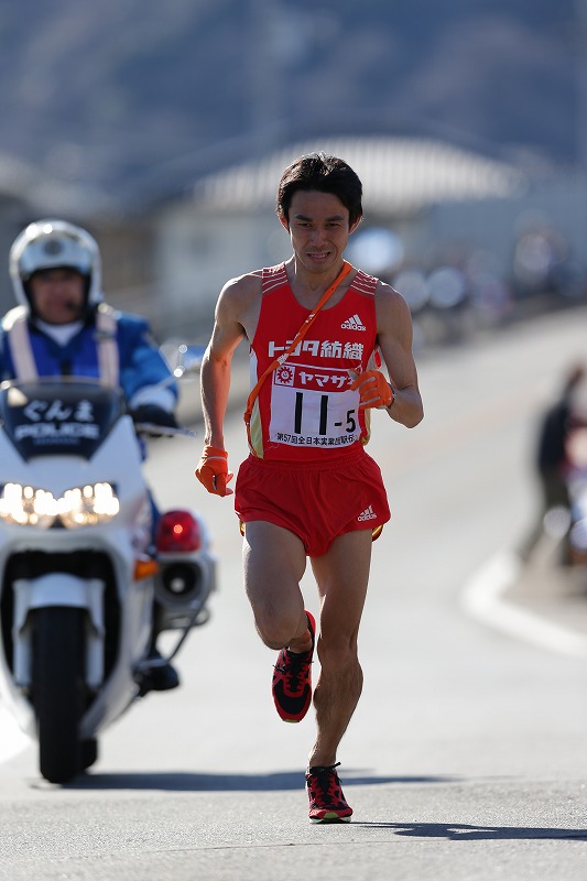 1区を走ったのは昨年も同区間で堅実な走りを見せた塩田選手。トヨタ自動車のエース宮脇選手が序盤から飛び出しますが、塩田選手はそれを追わず第2集団で好機を伺います。10kmを29分一桁で通過後、次第に集団が崩れ始め塩田選手もグループの前方をキープ。ラストスパートでも切れのある動きを見せた塩田選手は、先頭からは35秒遅れたものの、4位と同タイムの7位で襷を繋ぎ第1走者の役目を果たしました。