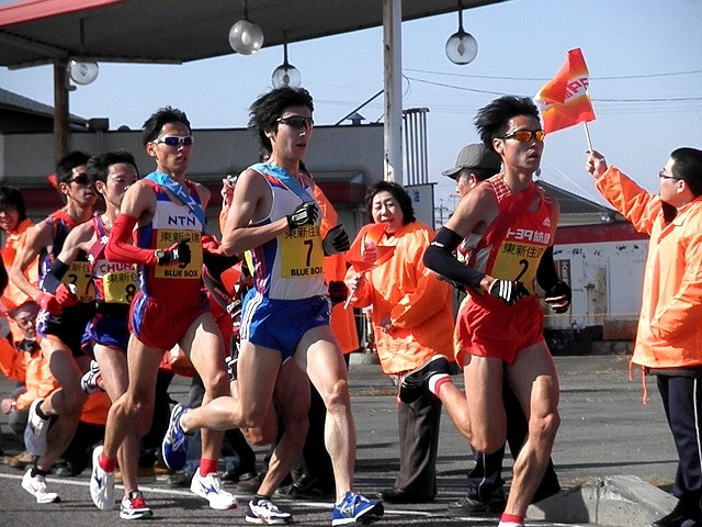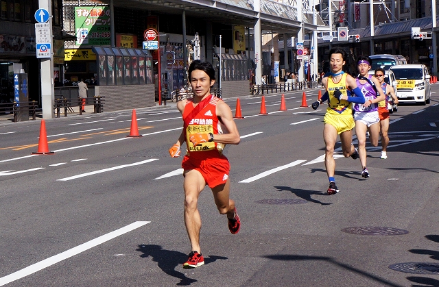 トップで走り出した5区田口選手は、追い風に乗り区間記録を狙える快調なペースで逃げきりを計りますが、残り1km地点で松原選手(トヨタ自動車)に並ばれます。ラストスパートでわずかに前に出てトップで中継しますが、勝負はアンカー勝負へと持ち込まれました。