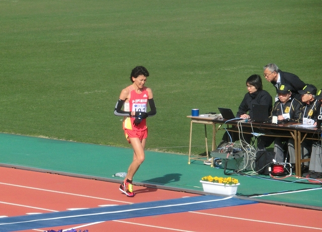 糟谷選手は一度集団から離れたものの、マイペースの走りで再び先頭集団に合流し30km地点を先頭集団で通過。2年ぶりの入賞を目指しますが、30kmを過ぎてペースメーカーが離脱すると各選手の駆け引きが始まり、疲れの見え始めた糟谷選手は徐々に遅れをとります。