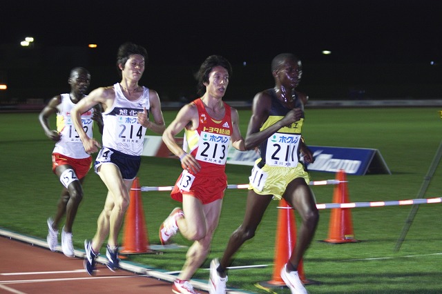ミカ・ジェル選手、中尾選手とケニア人選手ら4人が先頭集団を形成し、5000mを13分58秒で通過。ミカ・ジェル、中尾の両選手は余裕を持って通過し後半のペースアップに備えました。記録を意識した中尾選手は残り1400mで自らペースアップし後続を振り切り、27'47"00の突破を目前にしましたが惜しくも届きませんでした。